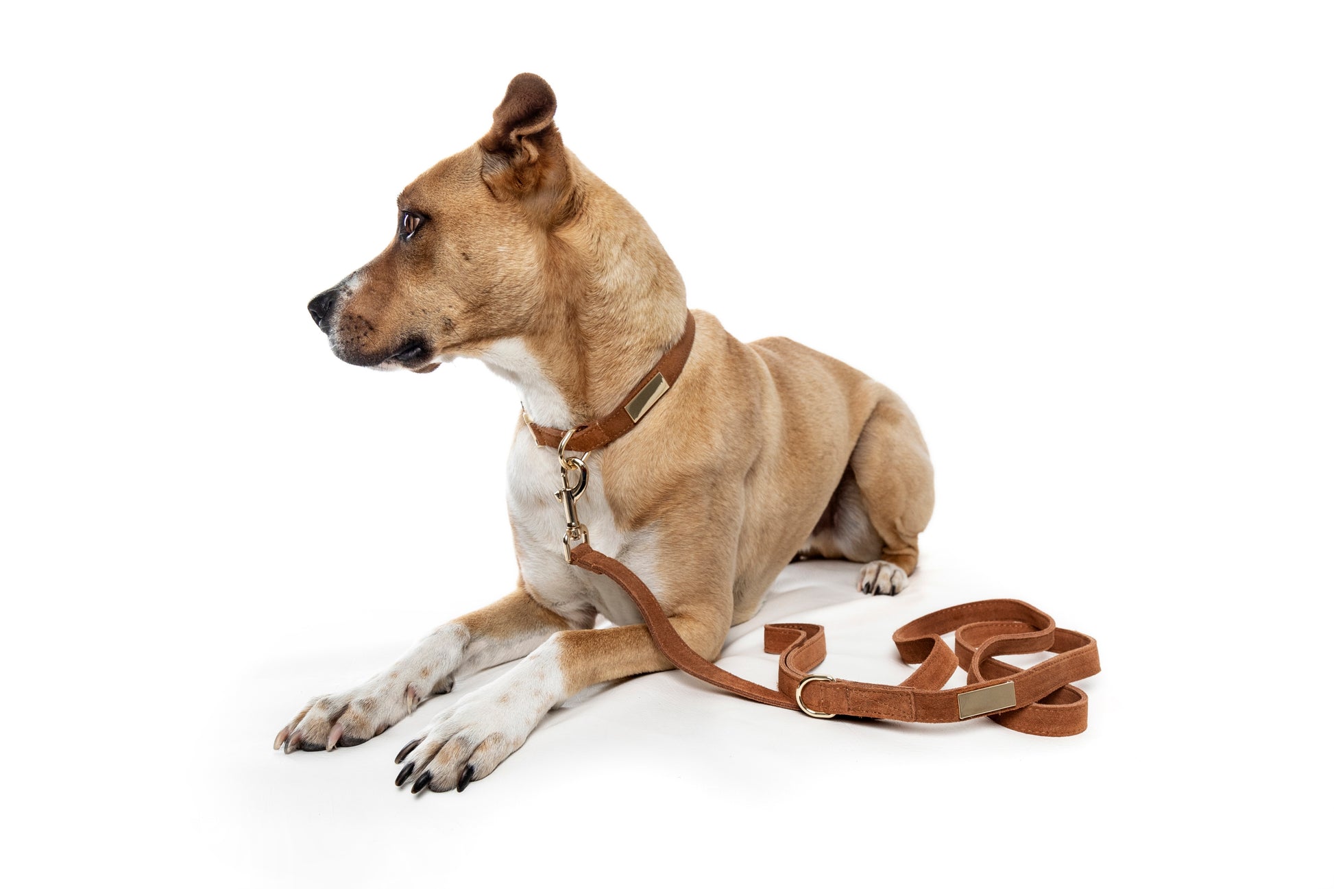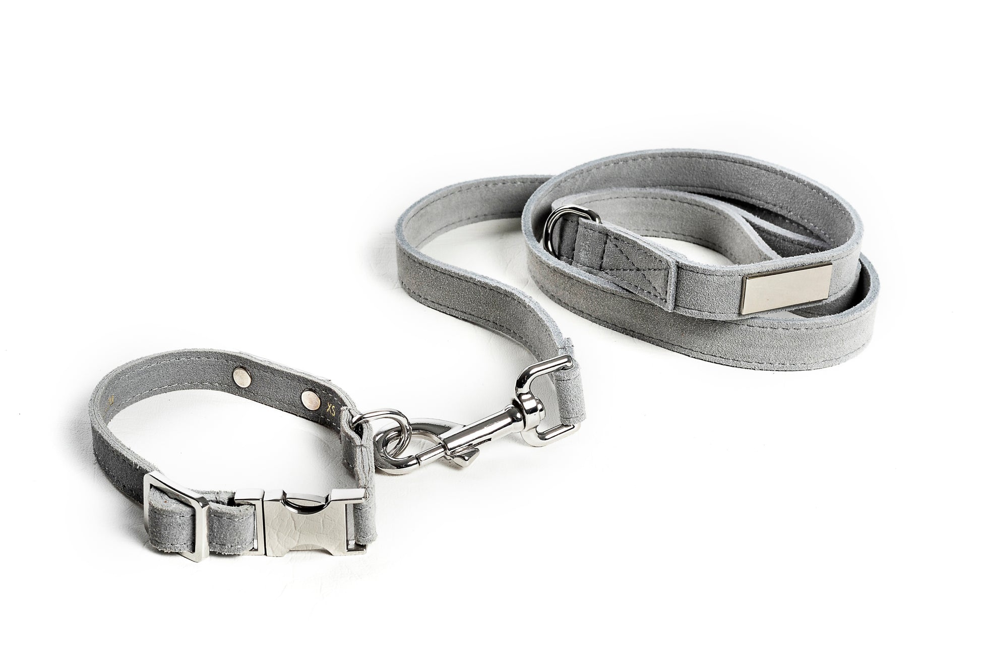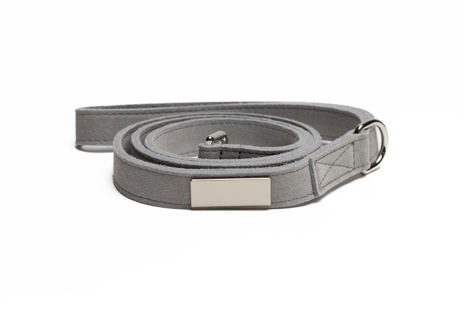 The Nala Leash combines comfort and style with its luxurious suede design. It's classic gray and brown tones provide a neutral look and its suede fabric is designed to be soft to hold. There is also a sturdy D-ring for doggy bag attachments.